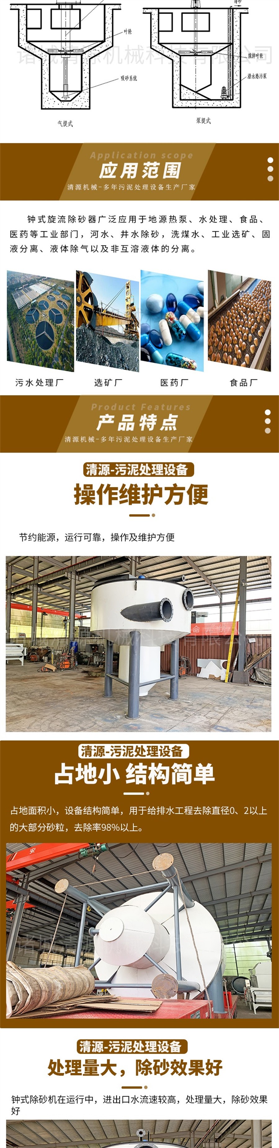 我公司除生產鐘式旋流除砂機外還生產洗砂污水處理設備,地埋式污水處理設備,生活污水處理設備,氣浮機,真空帶式過濾機,污泥壓濾機等其他環保設備。
