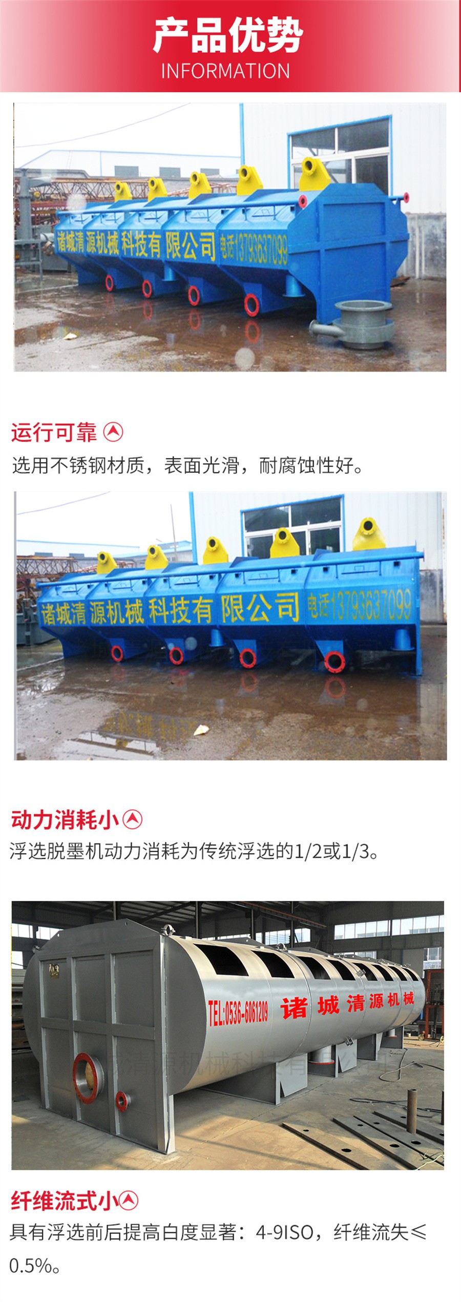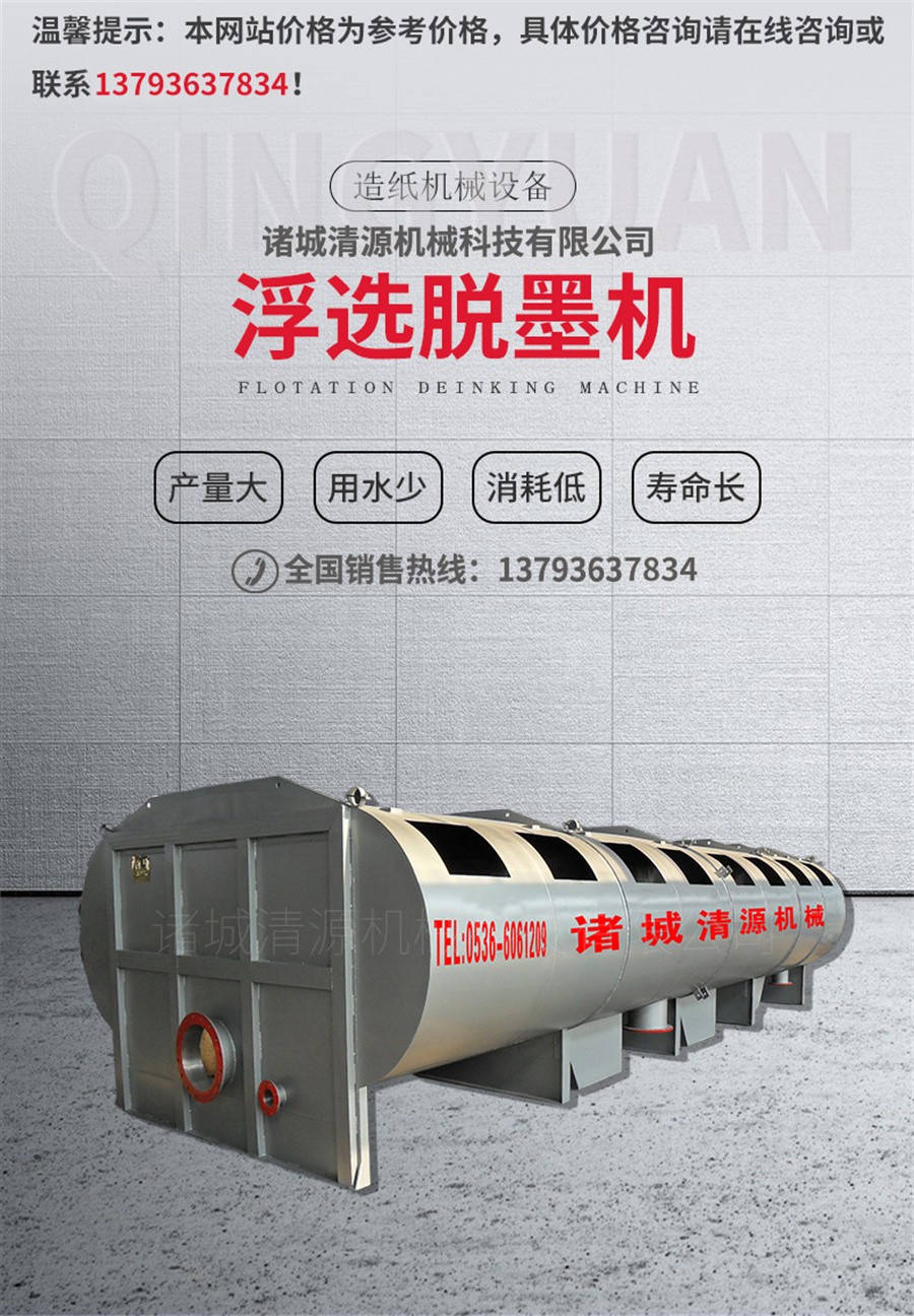 清源浮選機組供應與其它浮選脫墨裝置相比,在同等雜質去除率的前提下,本機組可提高生產能力20%;或者在同等生產能力的前提下,可比其它浮選脫墨裝置獲得更高的紙漿白度和其它灰分的去除,以及相應的長、短纖維損失的減少,動力比其它浮選脫墨槽在相同的產量下降低20%。
